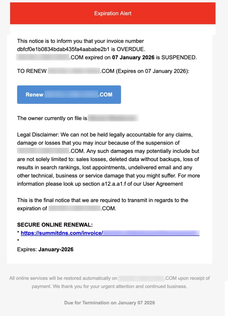 This morning, I received an urgent-looking email claiming that one of my domains had expired and was already suspended. The message included an invoice number, legal disclaimers, dire warnings about lost data and search rankings, and a large, friendly “Renew” button. Everything about it was designed to create panic and urgency.